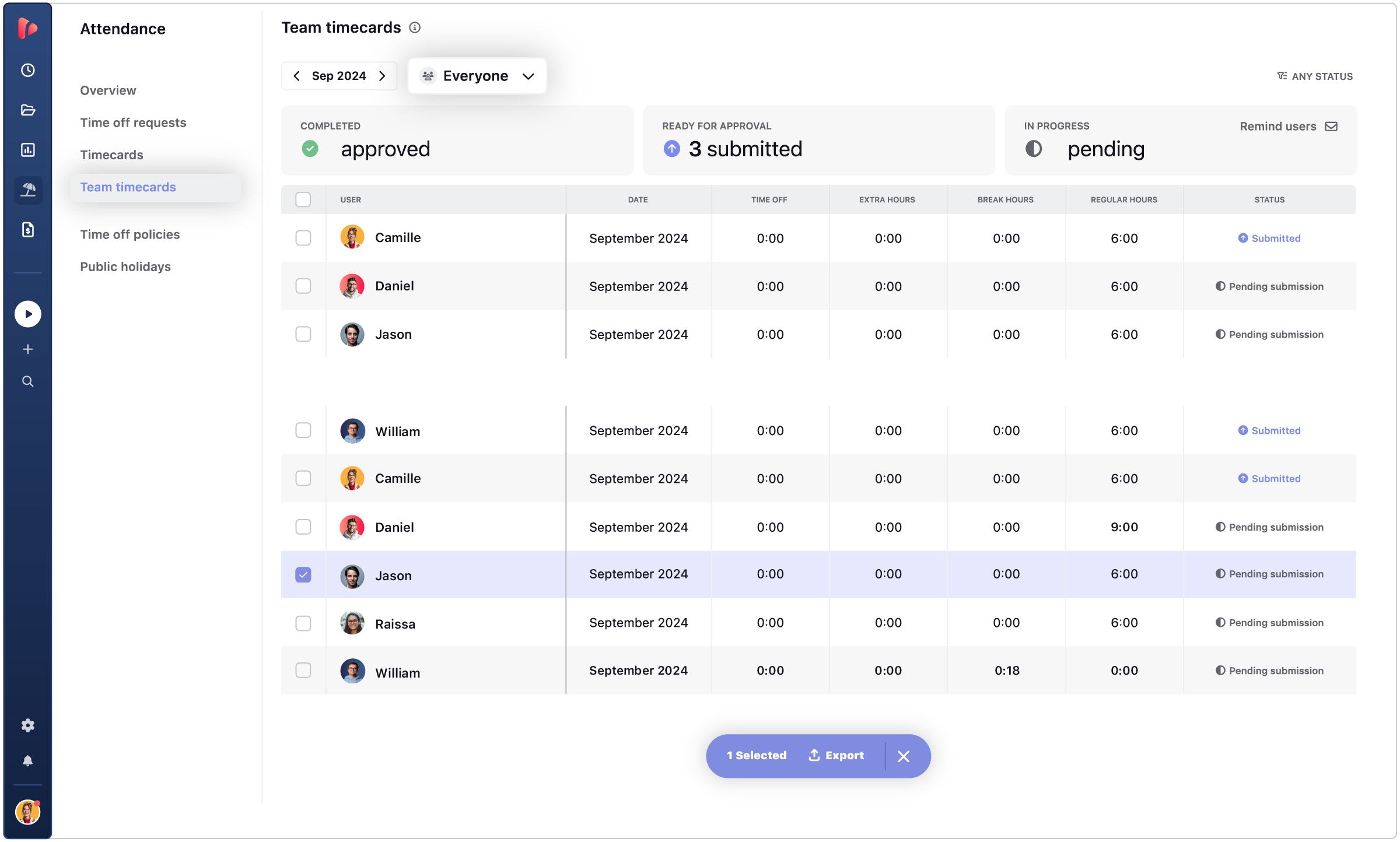 TrackingTimeの出勤管理ソフトウェアは、チームの出勤管理を効率化するために設計されています。直感的な出勤トラッカーを使用すれば、従業員の出勤状況を簡単に監視し、休暇申請を管理し、スケジュールを自動化することが、すべて一つのプラットフォームで可能です。